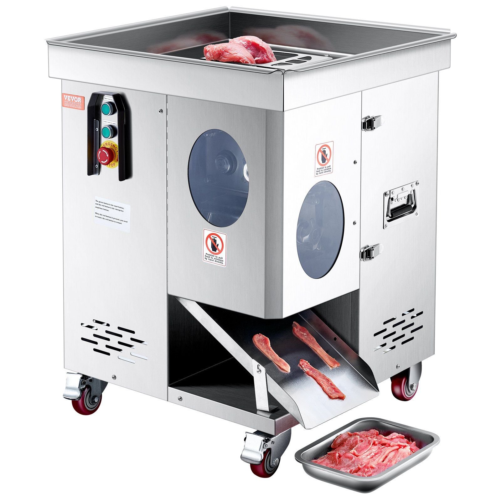 Suitable for kitchens, restaurants, supermarkets, and meat markets, this meat cutting machine is equipped with convenient wheels for easy movement and flexibility in any commercial setting.