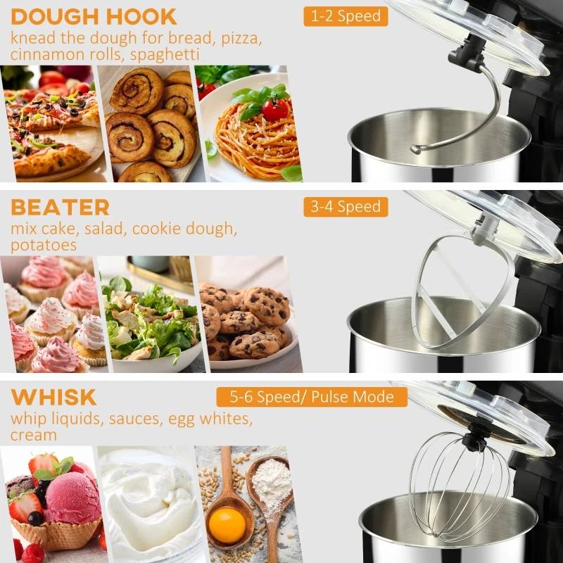 This Black Stainless Steel Tilt 600W Electric Mixer 6QT is designed with a high-performance 600W pure copper motor and multiple speed choice to more effectively knead dough and beat eggs, this food mixer provides versatility for frosting, creamy dressings, dough, and baked goods. This standing mixer has a 6-level speed ranging from low to high, providing options to knead gently and thoroughly mix,. Press the 'P' button to mix at the fastest speed in a short time. This stand mixer's 6qt mixing bowl lets you make two dozen cookies or four loaves of bread in a single batch. It also includes a dough hook, beater, and whisk to expand your culinary options. The tilt-head design allows less mess when changing out accessories. The suction cups under the bottom provide excellent stability. NOTE: Don't forget to put the bowl cover on top before turning it on.